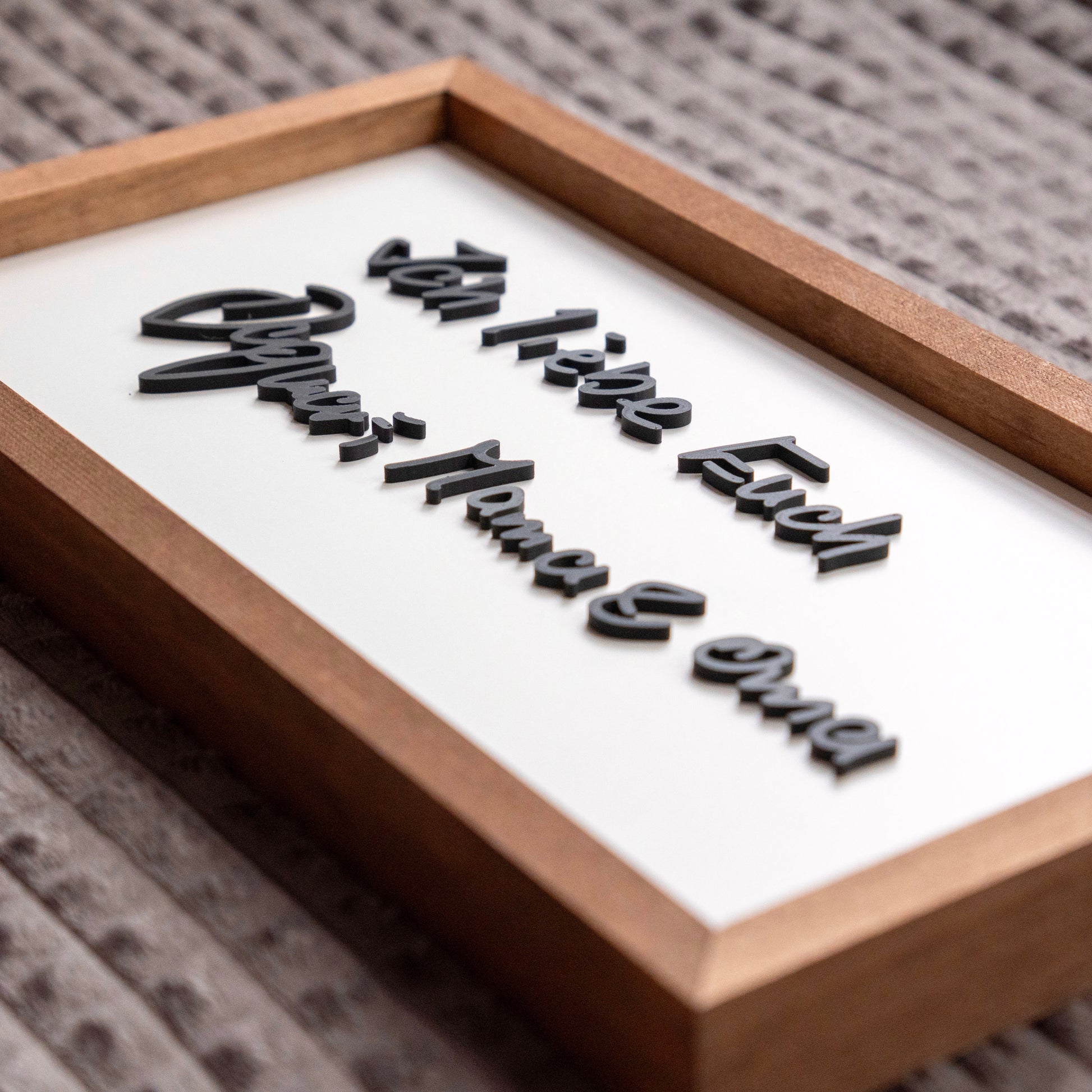 Der Bilderrahmen hat ein Außenmaß zwischen 15x33cm bis 24x29cm, je nachdem was besser zu dem Text passt. Maximal können 6 Wörter in dem Rahmen platziert werden.